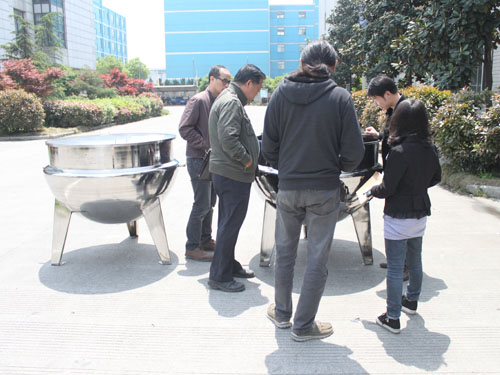 圖為客戶參觀準備包裝發(fā)貨的立式夾層鍋