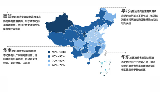 從地區(qū)上看,華北地區(qū)(除北京和天津兩個(gè)直轄市外)整體比例較低,西部地區(qū)比例很高,另外長(zhǎng)江流域省份也相對(duì)較高。一線城市消費(fèi)者對(duì)于液態(tài)奶健康方面的需求相對(duì)更加看重;二、三線城市以及其他中小城市則更加關(guān)注液態(tài)奶的味道、美容減肥效果、滿足小孩喜好等,且更易受身邊朋友的影響。