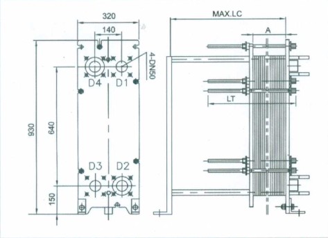 板式換熱器是由固定擋板、板片、移動擋板、立柱、上導(dǎo)軌、下導(dǎo)軌及固定螺栓組成。在固定擋板及移動擋板之間是一系列被固定的板片。每片板片均有墊圈,所以板片間構(gòu)成相互平行的封閉流道,介質(zhì)在每兩塊板片之間交替流動。