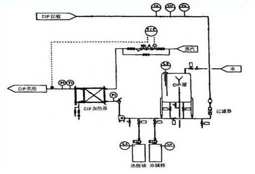 (3)被清洗的罐或管路與CIP清洗裝置通過配管形成回路,清洗結(jié)束后將清洗液排放。