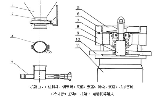 本機(jī)中與物料接觸的部分采用耐蝕不銹鋼材料。符合食品衛(wèi)生的要求。該機(jī)的工作是靠聯(lián)結(jié)在封閉電動(dòng)機(jī)不銹鋼套軸上的翼輪來達(dá)到混合的目的,并由不銹鋼彈簧、壓緊密封圈、密封圈等組成機(jī)械密封裝置,進(jìn)料斗與泵體用夾緊箍連接,電動(dòng)機(jī)與泵座用螺栓連接在機(jī)架上,整機(jī)可作任意移動(dòng),可以不用固定的安裝基礎(chǔ)。