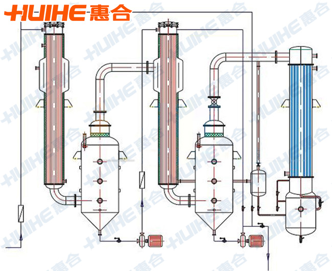 1、物料由列管上部進入,經物料分布器均勻進入每一根管中并沿管內表面形成薄膜。通過間壁傳熱,物料得以沸騰,沸騰的氣體帶動液體高速向下流動,進入汽液分離器,產品得以濃縮。