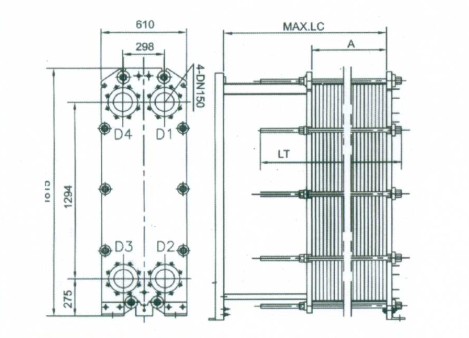 板式換熱器是由固定擋板、板片、移動擋板、立柱、上導(dǎo)軌、下導(dǎo)軌及固定螺栓組成。在固定擋板及移動擋板之間是一系列被固定的板片。每片板片均有墊圈,所以板片間構(gòu)成相互平行的封閉流道,介質(zhì)在每兩塊板片之間交替流動。